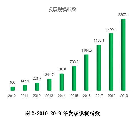 2019年,發(fā)展規(guī)模指數(shù)為2207.1,同比增長25.0%。