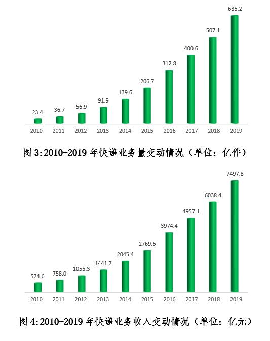 市場規(guī)模中高速增長。2019年,全國快遞企業(yè)日均快件處理量超1.7億件,同比增長25.3%,最高日處理量達(dá)5.4億件,同比增長28.5%。全國快遞業(yè)務(wù)量突破600億件,累計(jì)完成635.2億件,同比增長25.3%,增量規(guī)模連續(xù)兩年超過100億件??爝f業(yè)務(wù)收入累計(jì)完成7497.8億元,同比增長24.2%,量收增速差從去年的4.8%進(jìn)一步縮小為1.1%,行業(yè)逐漸由規(guī)模單向驅(qū)動(dòng)向規(guī)模效益雙向驅(qū)動(dòng)轉(zhuǎn)變。與2010年相比,快遞業(yè)務(wù)量收分別增長了26.1倍和12.0倍,業(yè)務(wù)收入年均復(fù)合增長率是同期國內(nèi)生產(chǎn)總值增速的4倍,成為拉動(dòng)經(jīng)濟(jì)增長的重要?jiǎng)恿Α?/span>