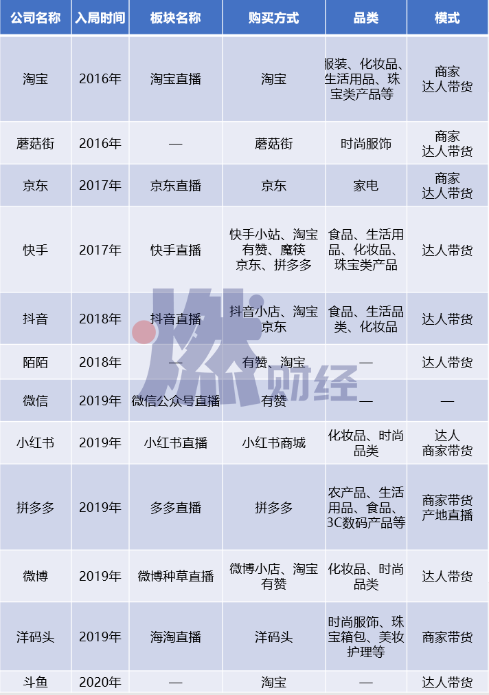 從這份名單可以看出,早期入局的公司多為電商平臺(tái),包括淘寶、蘑菇街、京東等,隨后擴(kuò)展至快手、抖音等短視頻平臺(tái),2019年以來(lái)入局的公司類型更為廣泛,包括微信、微博、小紅書(shū)、斗魚(yú)等社交、直播等平臺(tái),近日,百度也被曝出即將上線電商直播。