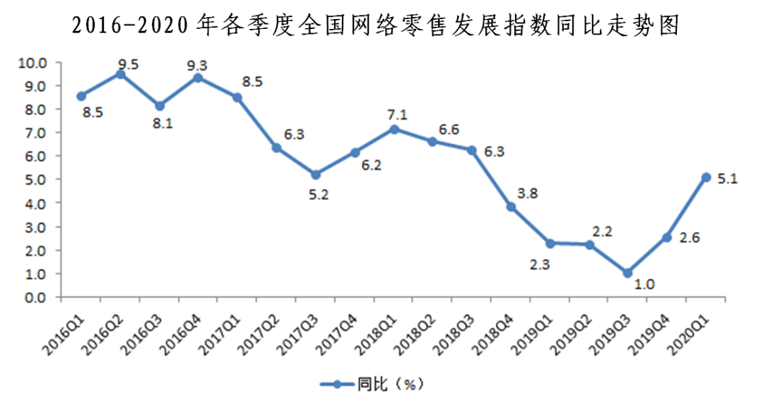 近日,中國國際電子商務(wù)中心與易觀聯(lián)合發(fā)布了2020年一季度“全國網(wǎng)絡(luò)零售發(fā)展指數(shù)”及其分指數(shù)。2020年一季度,全國網(wǎng)絡(luò)零售發(fā)展指數(shù)受疫情影響,環(huán)比下降2.7%,增速較上季度下降6.1個百分點;但同比仍增長5.1%,增速較上季度提升2.5個百分點。