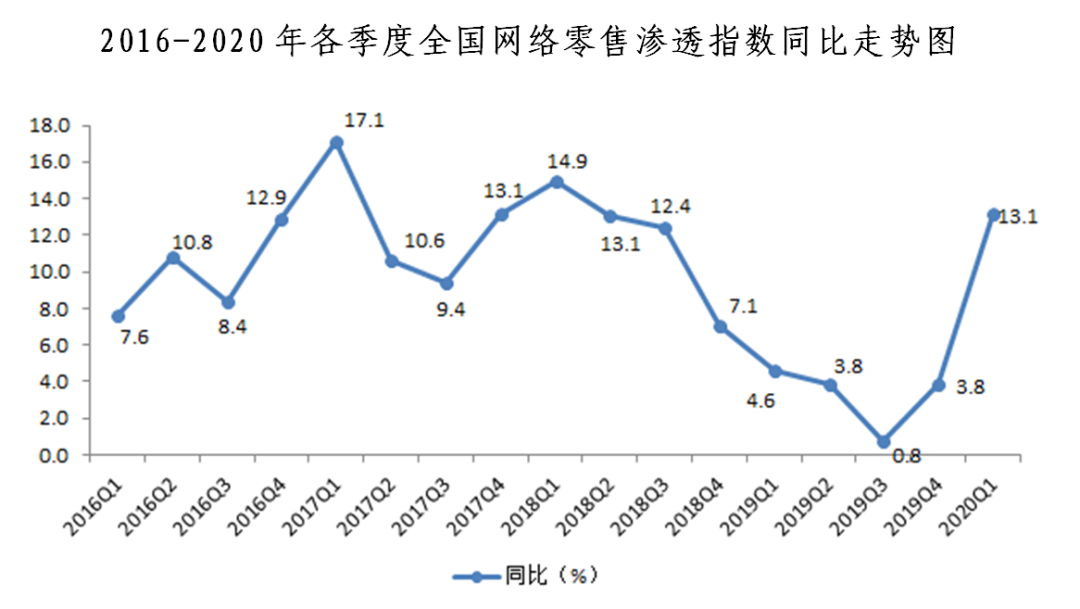 受疫情影響,線下商業(yè)嚴(yán)重受阻,各商家紛紛尋求線上渠道,生鮮到家、直播賣貨等新模式快速增長。根據(jù)國家統(tǒng)計局?jǐn)?shù)據(jù)計算,一季度實物商品網(wǎng)上零售額為18536億元,占社會消費品零售總額的比重達(dá)23.6%,比上年同期提升5.4個百分點。