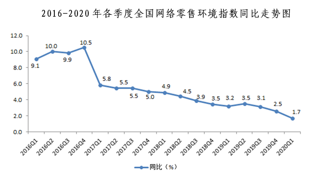 四、網(wǎng)絡(luò)零售環(huán)境指數(shù)同比增長1.7%,環(huán)比下降0.5%。